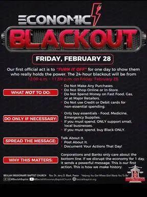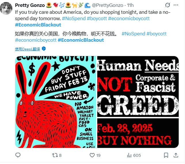 呼吁美国民众在2月28日全天停止任何形式的消费,包括线上和线下购物,避免在大型商场、加油站和快餐店消费。如果必须购买生活必需品,则应选择当地的小型企业,并尽量使用现金支付。